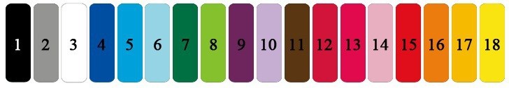 1 Black. 2 gray. 3 white. 4 navy blue. 5. Blue. 6 Sky blue. 7 Dark green. 8 light green. 9 violets. 10. Light purple. 11 brown. 12 burgundy. 13 hot pink.14 soft pink. 15 red. 16 orange. 17 beige. 18 golden yellow